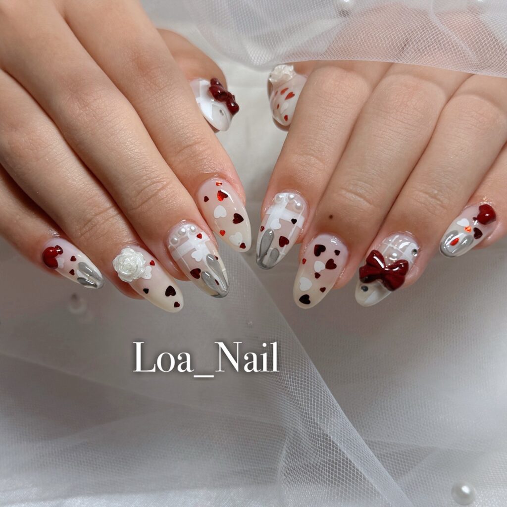 クリア感のベースに、大小さまざまなハートモチーフを散りばめた甘めデザイン💕