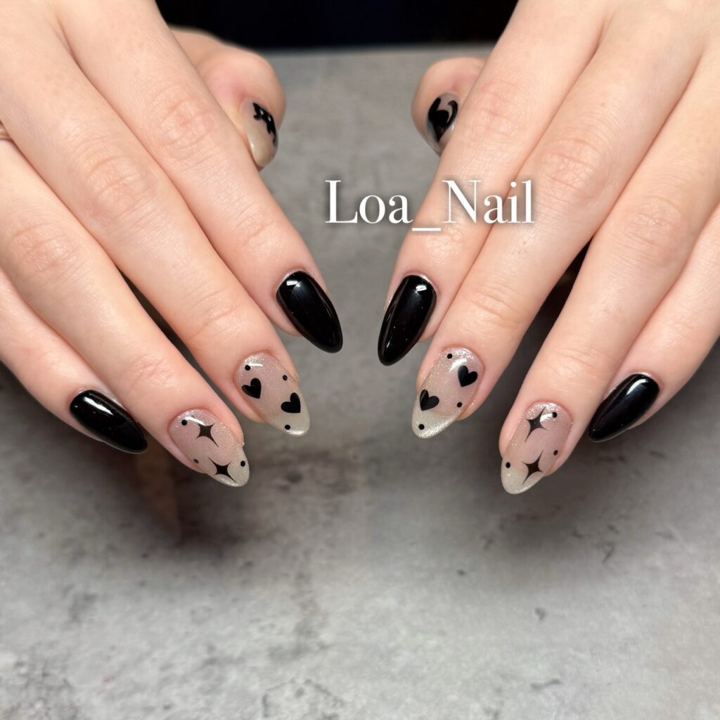 艶やかなブラックと、シアーなベースに描かれたハート&スターが印象的なデザイン。